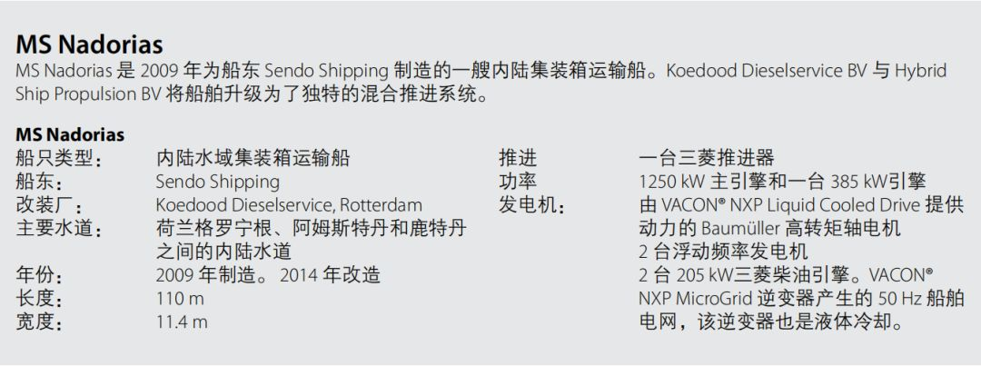 船舶MS Nadorias于2014年进行了改造,现在由HSP的柴油电动混合推进系统提供动力,该系统使用的是丹佛斯VACON® NXP Liquid Cooled Drive。
