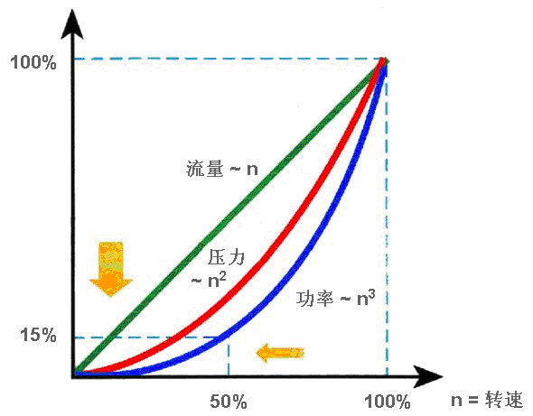 正如前面提到的,轴功率P与转速n的三次方成正比。采用变频器进行调速,当流量下降到80%时,转速也下降到80%,而轴功率N将下降到额定功率的51.2%,如果流量下降到60%,轴功率N可下降到额定功率的21.6%,当然还需要考虑由于转速降低会引起的效率降低及附加控制装置的效率影响等.即使这样,这个节能数字也是很可观的,因此在装有风机水泵的机械中,采用转速控制方式来调节风量或流量,在节能上是个有效的方法。