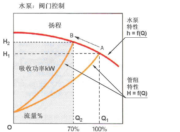 电机在恒速运行时,采取调节阀门的办法获得70%的流量(工作点为 B),将导致管阻增大,水泵轴功率相当于Q2BH2O所包容的面积,所以轴功率下降不大。