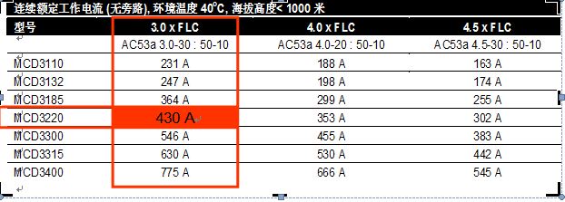 当起动电流倍数为3倍时,额定电机满载电流430A,由此推算其额定输出电流能力为: