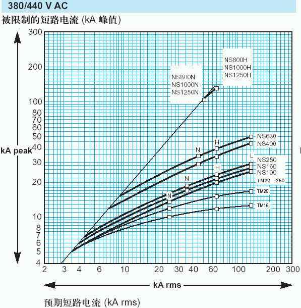再看一下施耐德NS断路器的高级功能 — reflex能量跳闸功能,据称在短路故障时能产生一种强大气体压力直接作用于一个活塞机构,使断路器快速可靠地分断。由于动作非常迅速,<10ms,所以如同快速熔断器一样,具有自然抑制短路电流的功能。其限流特性曲线如下图: