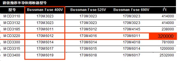 丹佛斯说明书中要求MCD3220前级安装BUSSMANN的170M6012半导体熔断器,要求的可控硅需要的短路保护I2t值为320000A2S,也就是MCD3220软起动器使用的可控硅T588N16TOF需要的短路保护I2t值。