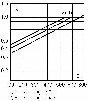 由于BUSSMANN的手册中给出的弧断I2t值为660V电网电压时的数据,所以还要查表求出400V电网电压时的修正系数,从下图可以查到修正系数约为0.61。