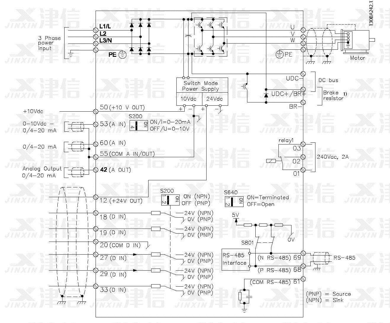 1) 内置制动斩波器仅在 3 相设备上可用。