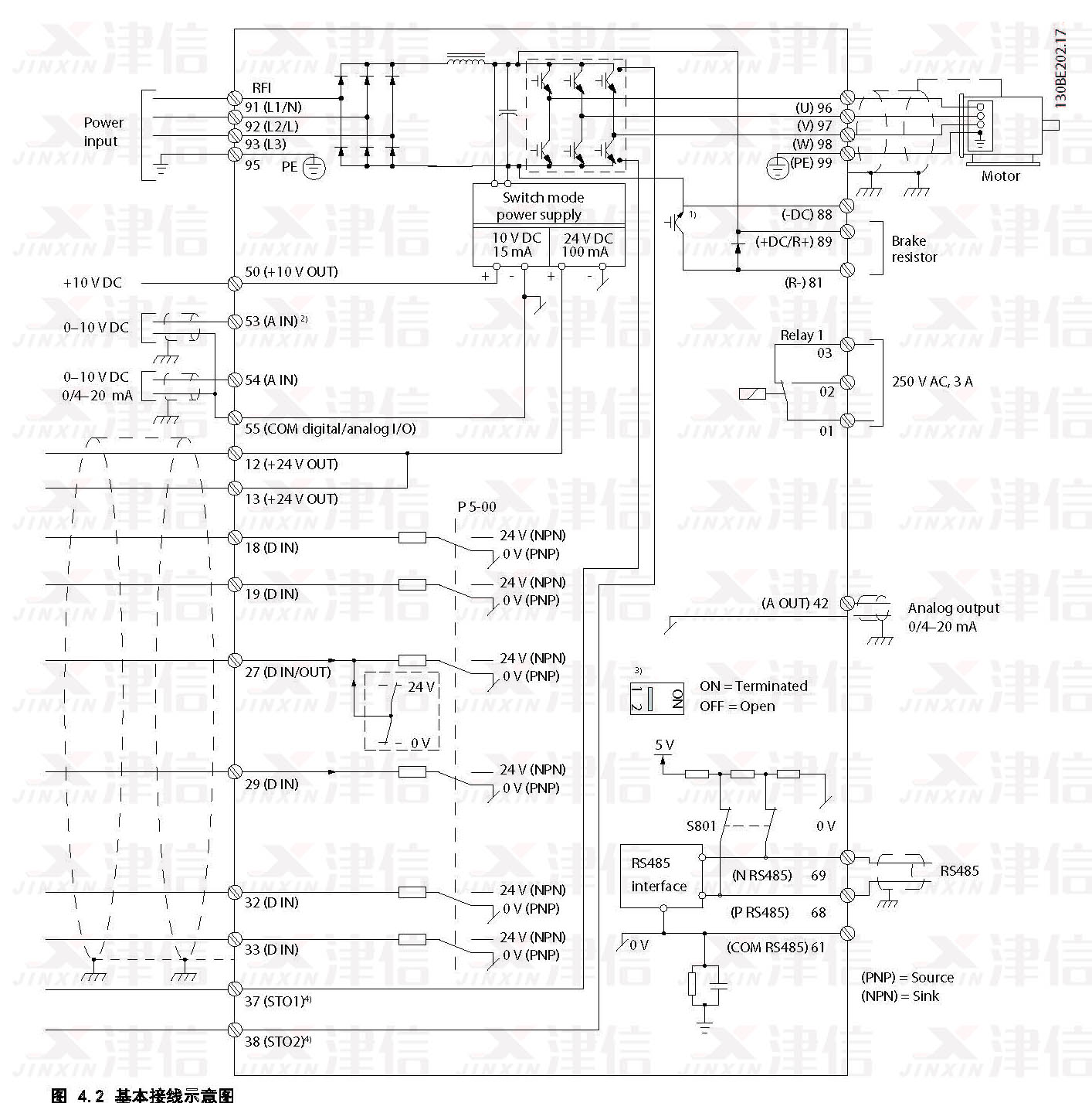 4) 开关 S801(总线端子)可用于端接 RS485 端口(端子 68 和 69)。