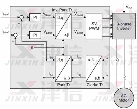 V/F方式是早期变频器驱动永磁同步电机的控制方式之一,这种方式需要放大变频器的功率,将永磁同步电机当作普通的交流异步电机,只做简单的压频比控制。同时,对永磁同步电机的感应电势波形要求较高,电机电流中含有不合理的磁场电流成分,无法体现出永磁同步电机高效节能的优势,还容易造成失速、过流等问题,因此现在已经不推荐使用了。