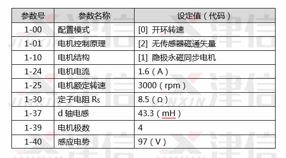 丹佛斯FC360系列变频器可以为各种工业应用提供精确、有效的电机控制,并全面支持各类永磁同步电机。本案例中电机额定电流为1.6A,所以选择0.75kW的变频器已经很充分了。变频器使用VVCplus 控制模式,参数设置如下: