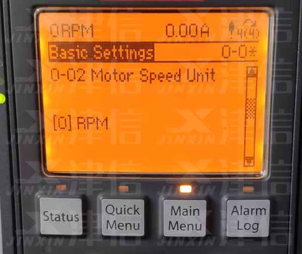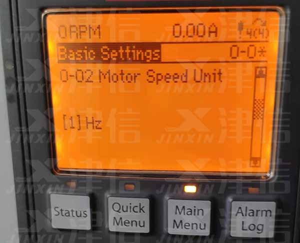 选择0-02,选择电机速度单位,默认为选项[0]:RPM,[1]为Hz