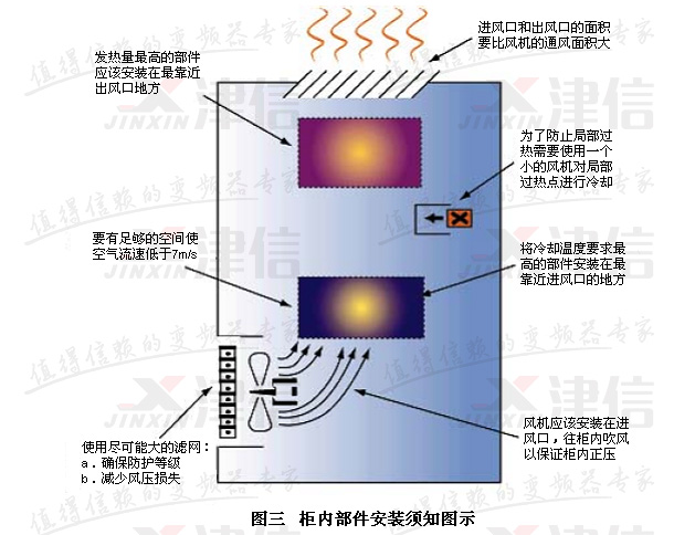 9) 确保从变频器的风路不会发生“短路”,即进入变频器的大部分空气不能是变频器的排出空气,在柜体内安装必要的隔板就可以防止此类情况。