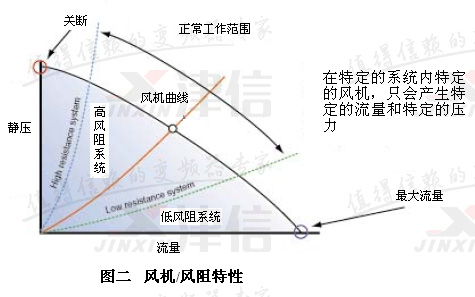 选择风机的基本原则:在特定的系统里特定的风机,只会产生特定的流量和特定的压力。风机输出压力特性曲线和系统风阻特性曲线的交点就是风机的工作点。