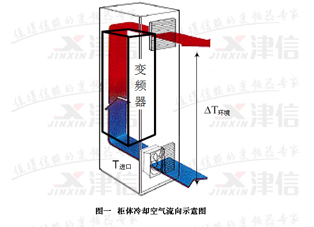 变频器一般通过变频器内置的风扇来散热,如果变频器安排在柜体内,这会导致柜体温度升高。虽然柜体的柜壁也有一定的散热能力,但是由于柜体的柜壁散热能力小于50W,在计算中,这部分散热可以忽略不计,所以还需要采取其他外部措施来散热。最典型的散热方式是在柜门或柜壁上安装风扇,如图一所示。