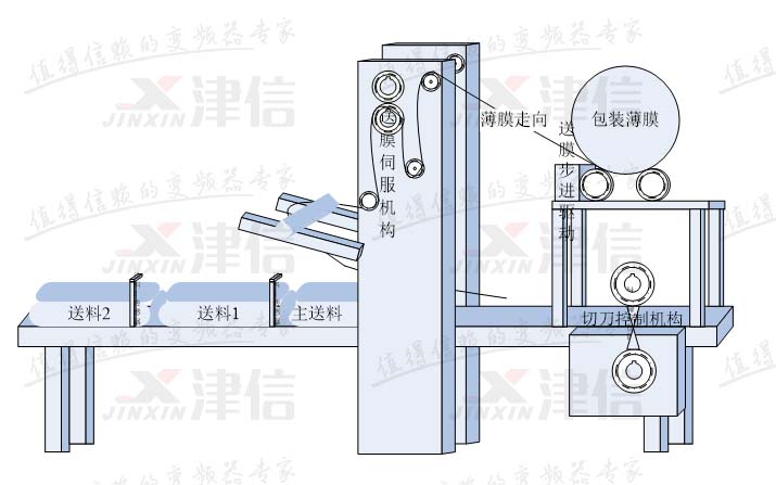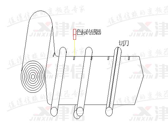 送膜控制有定长送膜和色标对标送膜两种情况。定长送膜,只需根据主轴编码器信号,主轴转一圈(输送一个物料),送膜部分输送一段固定长度的膜即可,不需动态调整;色标对标送膜,不但要求主轴转一圈输送一段固定长度的膜,还要求膜上的色标点正好落在主轴的设定相位点上,以使横切刀能精确地切在色标点上。因此色标对标送膜还需要根据检测到的实际色标相位差,在生产过程中动态调整送膜电机的相位。