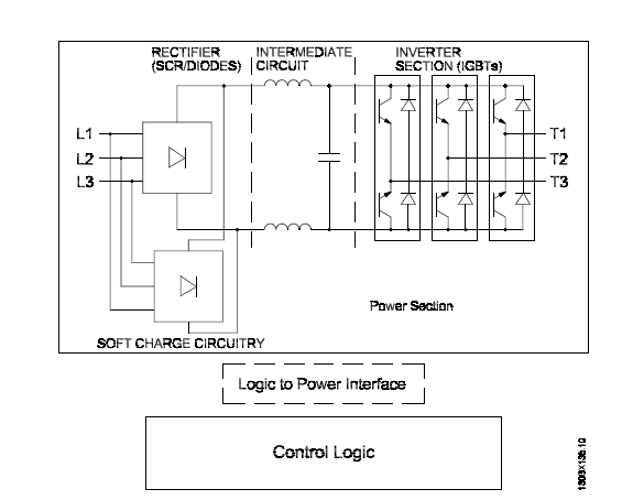 电压在经过整流器部分后,便会到达中间部分。整流电压通过由直流总线感应器和直流总线电容器组组成的正弦波滤波器电路进行平抑。