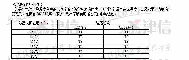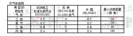 注:中国GB3836标准规定ⅡC级最小点燃能量为19微焦耳,ⅡA级最小点燃能量为200微焦耳。气体分组和点燃温度,在一定环境温度和压力下与可燃性气体和空气的混合浓度有关。