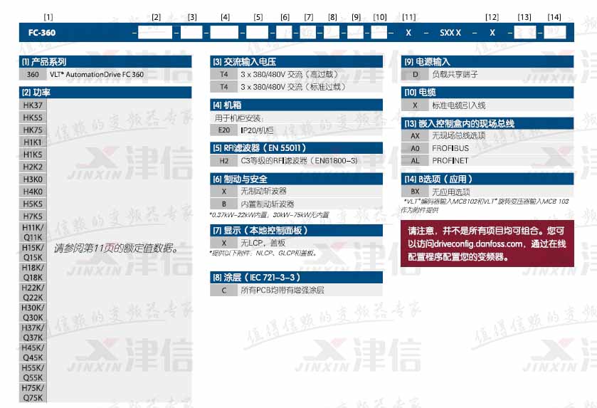 如FC360H1K5T4E20H2BXCDXXSXXXXALBX,代表380V,1.5KW,IP20,C3等级内置滤波器,内置制动,PROFINET现场总线
