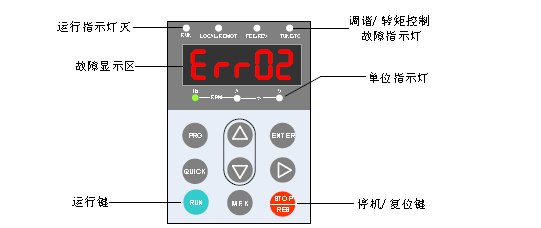 Err02 加速过电流 变频器输出回路存在接地或短路 排除外围故障,检测电机或接触器是否短路