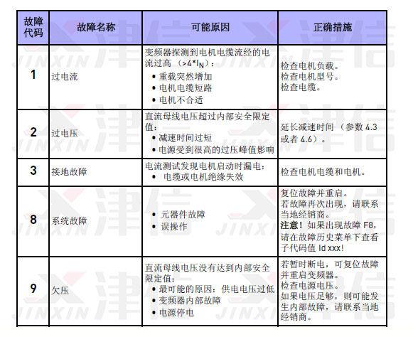 当控制接口显示在当前故障菜单(FTXX)时按下BACK / RESET 键,或者当控制接口显示在当前故障子菜单(F5.x)时长按BACK / RESET 键(大于2 秒),或者通过I / O 端子或现场总线,可以对当前故障复位。