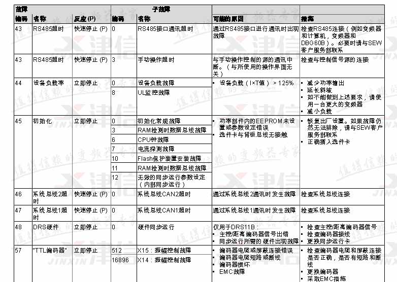 SEW变频器故障代码F43,F44,F45,F46,F47,F48,F57,具体如下: