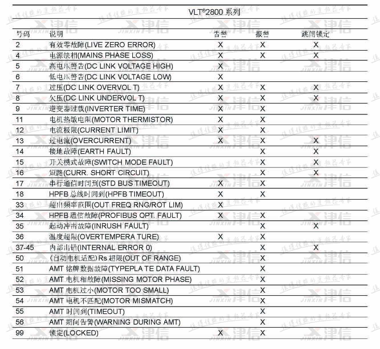 丹佛斯VLT2800系列变频器故障代码和报警信息如下:
