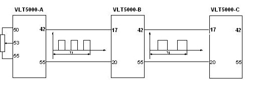 系统由5台VLT5000系列变频器及辅助的开关、指示灯、电位器及必要的空开等电气器件组成。图-1中A变频器的速度作为主速给定(它自身的速度由外部电位器给定), A变频器的42号端子对应自身输出转速,自动的转化为脉冲信号(频率)输出给B变频器,作为B变频器的速度给定信号(通过B变频器的29号端子来接收脉冲信号),然后再由B变频器通过修改内部参数327号,经过计算后相应的输出一定的转速。同理B变频器对应自身输出转速自动的转化为脉冲信号(频率)通过42号端子输出脉冲信号(频率)作为C变频器的速度给定信号(通过C变频器的29号端子来接收脉冲信号),以此类推,一直到E变频器。在此过程中,所有速度给定信号都是数字式的(既速度信号通过给定的脉冲频率的变化,结合自身内部的计算实现不同的转速)。