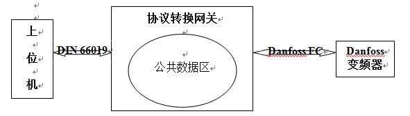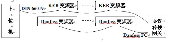 为了节省投资,变频器替换采取逐步进行方式,即损坏一台KEB变频器,替换一台。也就是说系统中将同时存在两种变频器和两种协议。现在要开发的通讯协议转换网关就是要使其对上位机而言,丹佛斯依然被视作DIN 66019协议的数据设备;而对于Danfoss变频器而言,还是在Danfoss FC协议控制下工作。此外,根据功能需求分析,该协议转换网关需要具有伸缩性,即增加Danfoss变频器时,需要将新增加的Danfoss变频器包装成DIN 66019协议下的设备,而不管羞羞动漫在线观看的数量多少,在上位机看来,它们应该是DIN 66019协议下的与原KEB变频器没有任何冲突的设备。两种协议并存的结构框图如图2所示。