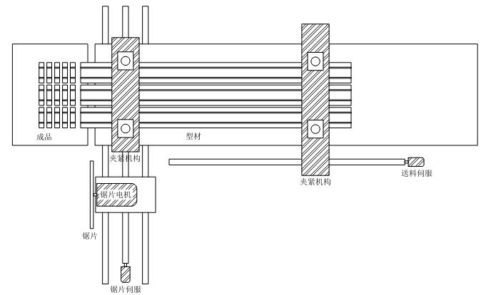 1.夹紧机构:机械中包含两个夹紧机构用于夹紧型材,一个负责在锯切的时候防止型材移位,另一个由送料伺服带动,用于带动型材完成型材进给。
