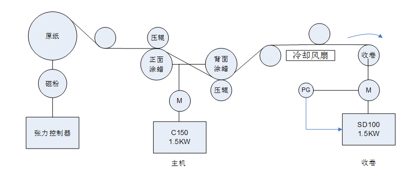 纸张涂蜡设备是将原纸两面均匀地涂上液态蜡,再将涂蜡后的材料以中心卷取的方式收好。整机以涂蜡部位作为主机,收卷采用锥度张力收卷,整机速度在150-200 m/min运行。