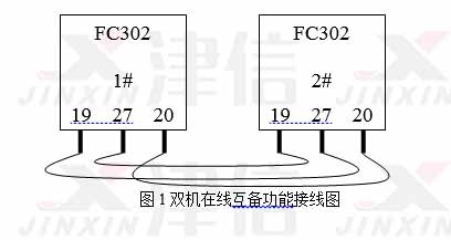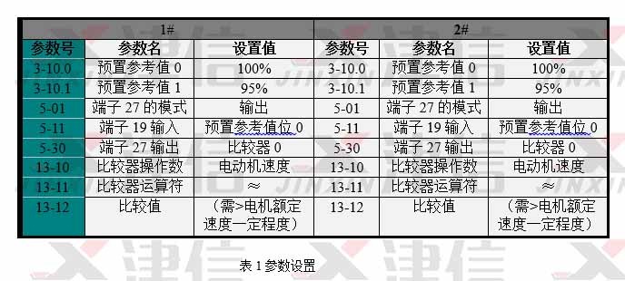 2、若1#机故障停机,端子27无高电平输出,2#机则激活预置参考值0,以100%速度运行;
