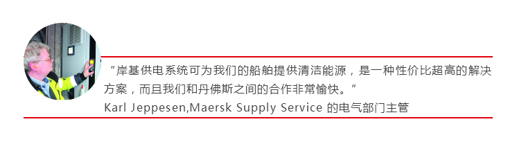 2017年初,Maersk Supply Service公司的电气部门主管Karl Jeppesen针对公司管理提出了一个商业案例,即使用岸电为船舶供电,预计在6个月内实现投资回报。很快,公司就通过了这个岸电项目,而且到2017年10月时整套系统就已完全投入运行。