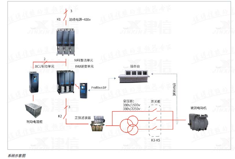 这个项目是Danfoss公司首次同天作电气的合作项目;项目中采 用了以丹佛斯公司VACON® NX系列变频器为电源核心的测试电源解决方案。单元+逆变单元+制动单元)、正弦滤波器、升压变压器、制动电阻以及输出电压切换开关构成。可以提供最高至2250V的正弦电压输出。天作电气成柜。另外包含测试操作台,以及为了满足测试工艺而选用的各种传感器,功率分析仪器等。