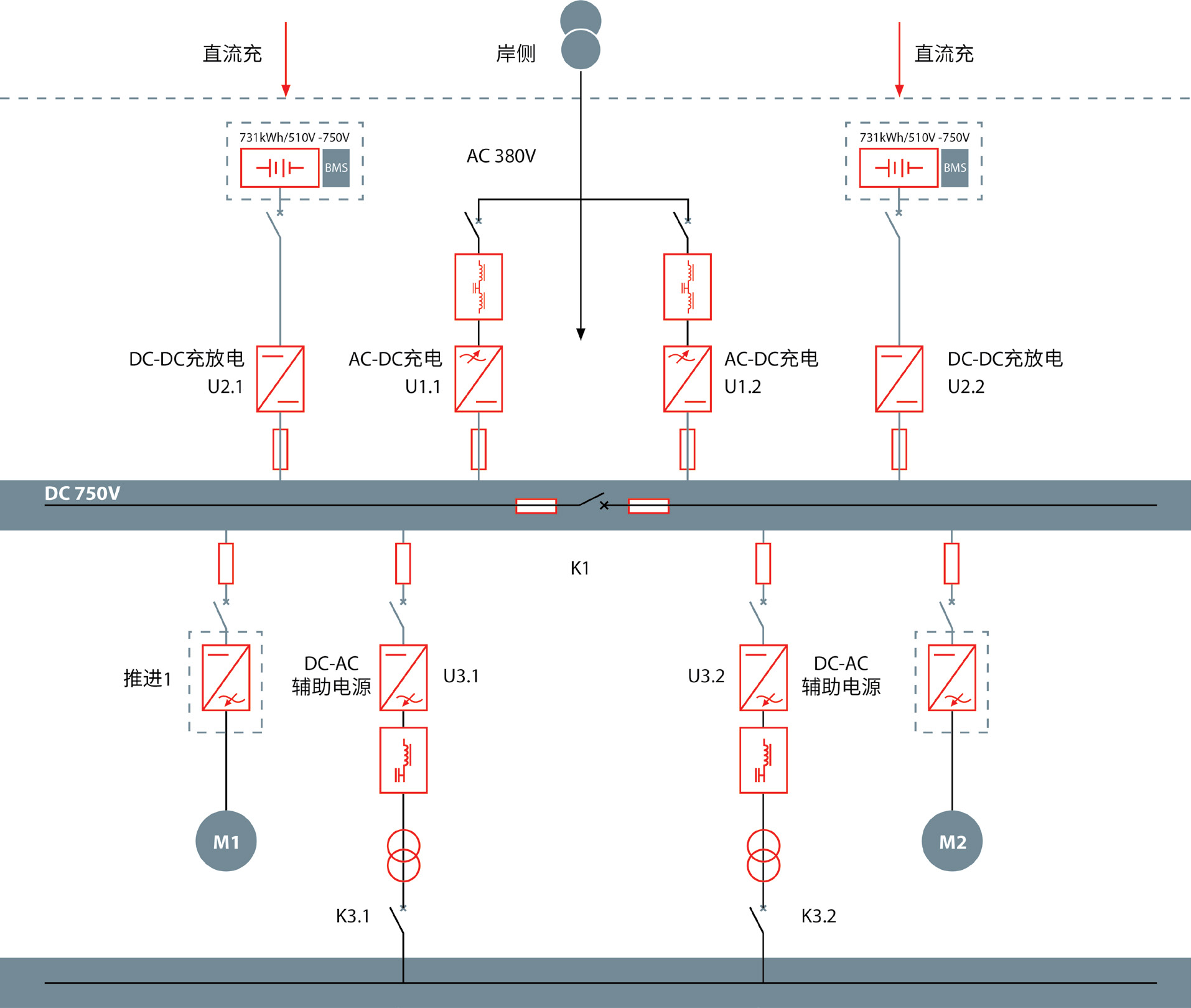 针对该电动船使用航线特点,提供交流充电桩满足其充电灵活性,丹佛斯AFE产品采用四象限整流技术,可为电池灵活提供相应的直流充电电压,并且可将对岸上电网的污染降低至最小。