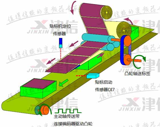 凸轮轴接收来自主轴的脉冲信号,依主轴节奏进行贴标动作,传送标签时需很准确平稳,在粘贴标签时,必须要能稳定控制运行速度与主轴同步,否则标签贴起来会不平顺。