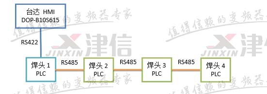 HMI和焊头1的PLC之间采用三菱支持的RS422通讯,通讯速率可达115200bps。焊头1的PLC和其它三个焊头的PLC之间采用三菱PLC支持的N:N网络,通讯速率最高为19200bps。